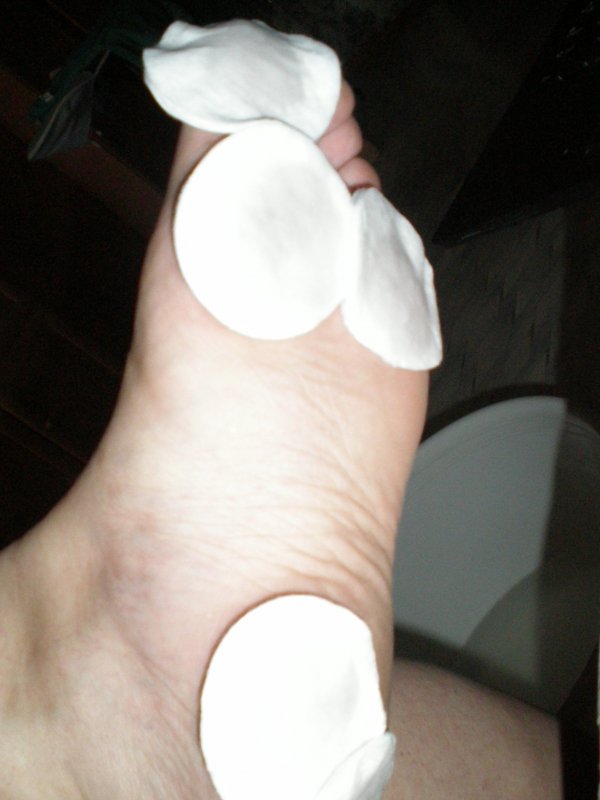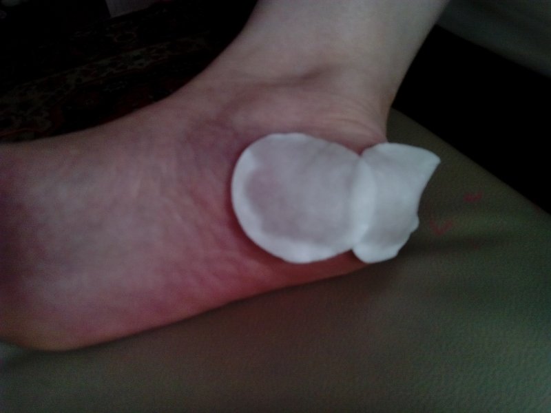 Следовала согласно инструкции. Держала по три минуты два раза, боялась, что съест мои ножки. Но нет. Вообщем не очень удобно сидеть с ватными дисками. Я решила эту проблему - обматывала ногу пищевой пленкой. Очень удобно. Я прям чуть-чуть обматывала, т.е. закрепила и все. Очень удобно. Одну ногу обматала, другую уже можно тереть.