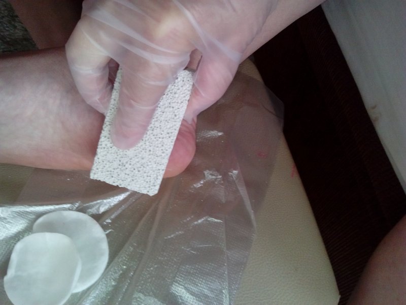 Понравилось снимать пемзой: она скользит, как по мыльному раствору, а как только перестает скользить, понятно, что вся растворившаяся кожа снята.