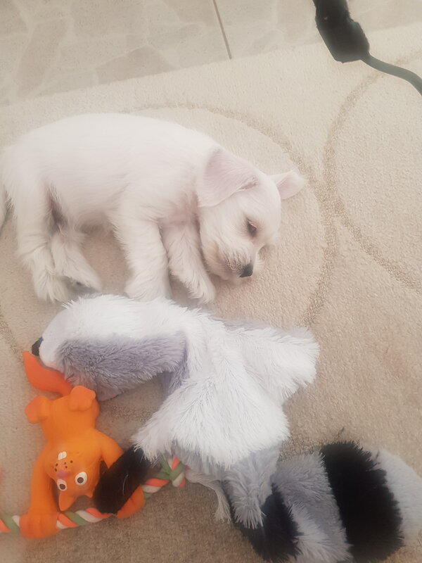 О! Игрухи ещё целые на фото щеночек очень скоро это исправит  |