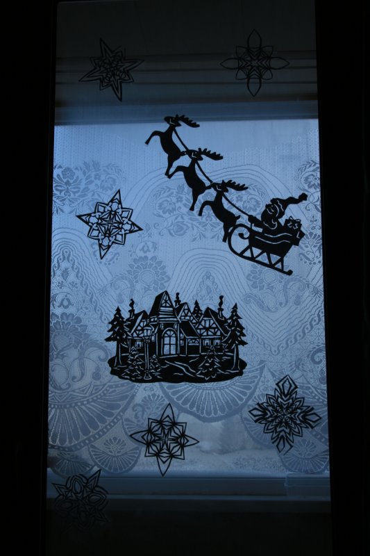 Украсила вот окно. Здесь и вытынанки и покупные картинки и зубная паста поучаствовала. В общем, слепила картину из того, что было. )))) Правда фото не очень, но это у меня как обычно и злосчастный вентилятор на крыше весь вид портит.