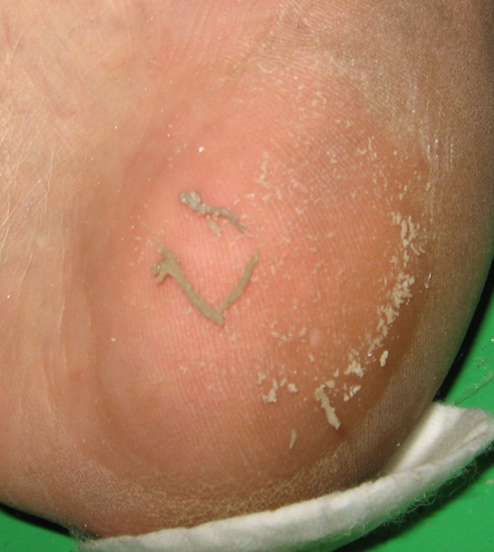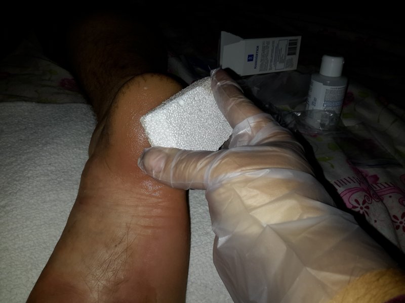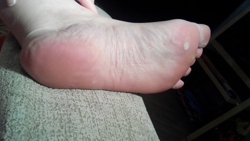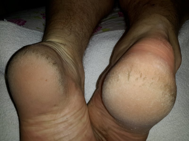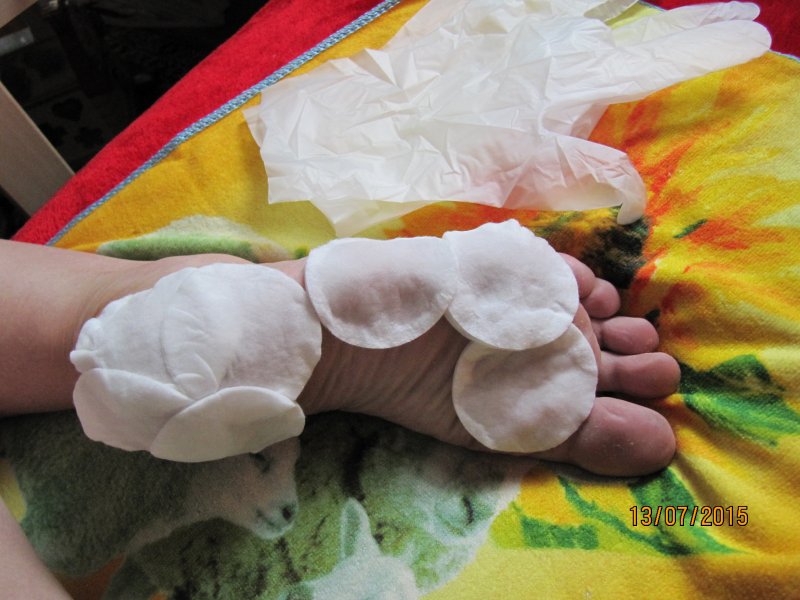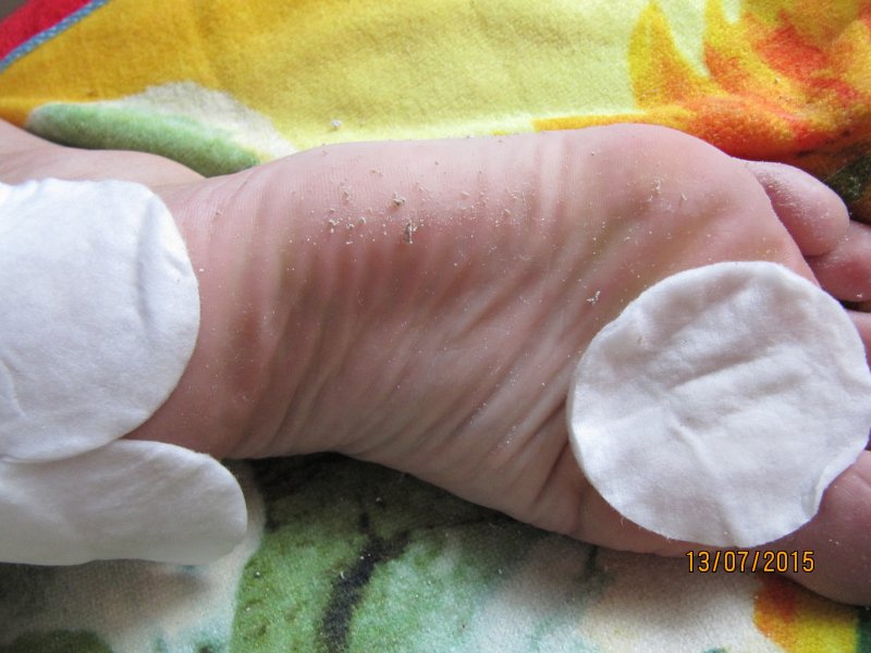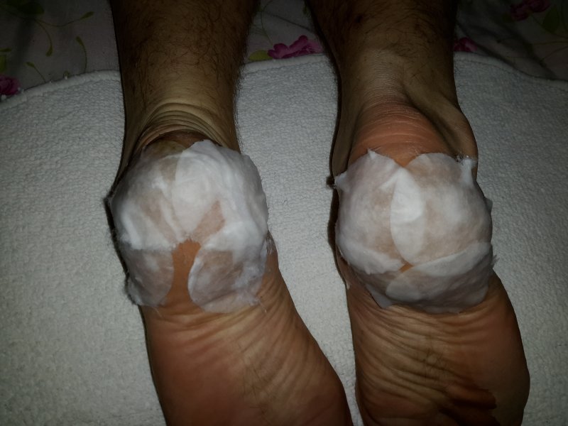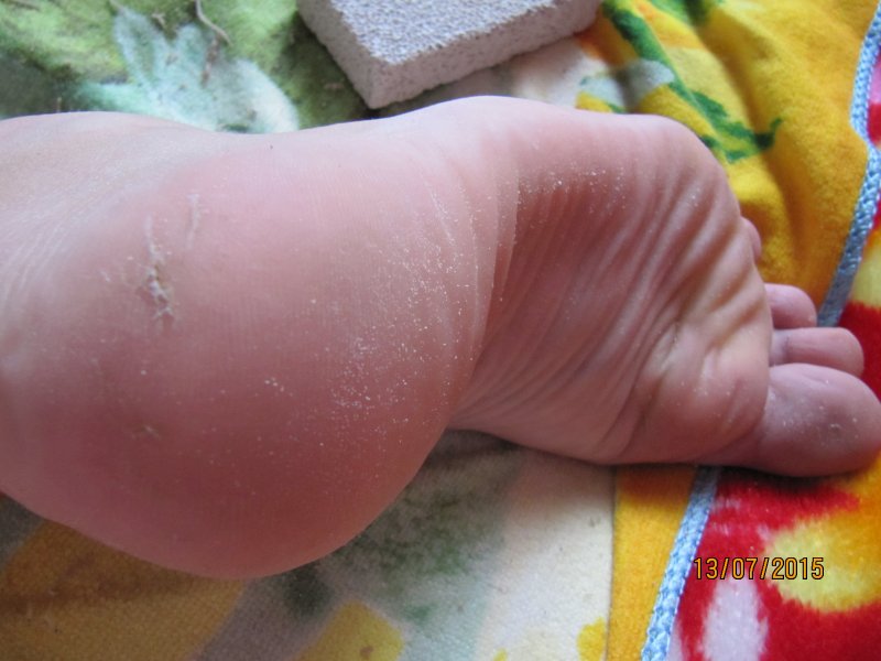 Хотела провести в начале на муже, но он со своим графиком работы приходил очень поздно. Решила провести на себе. У меня одна пятка проблемная, на фото видно.