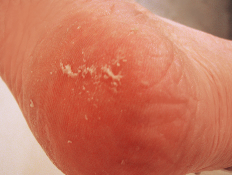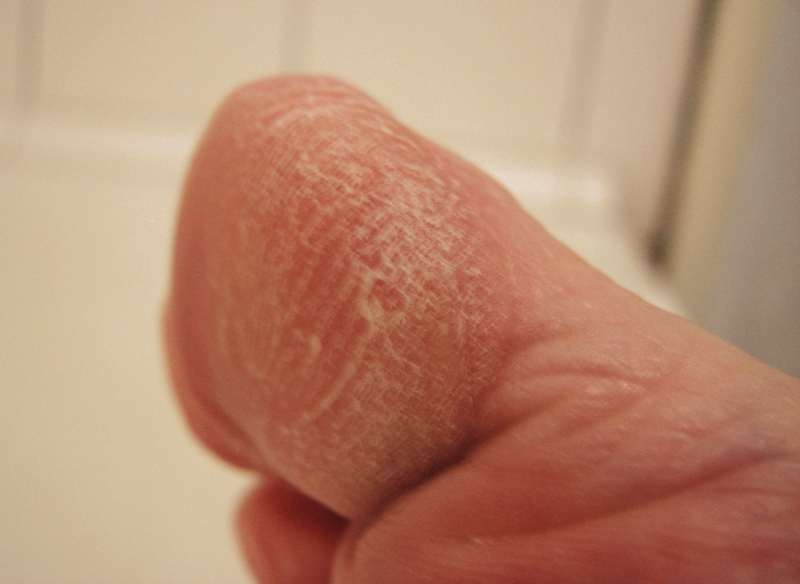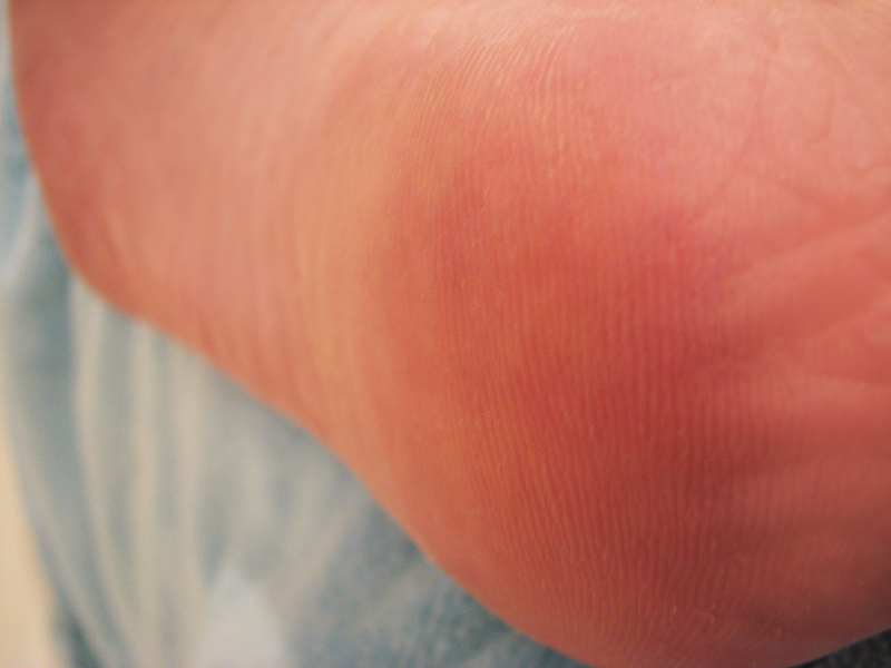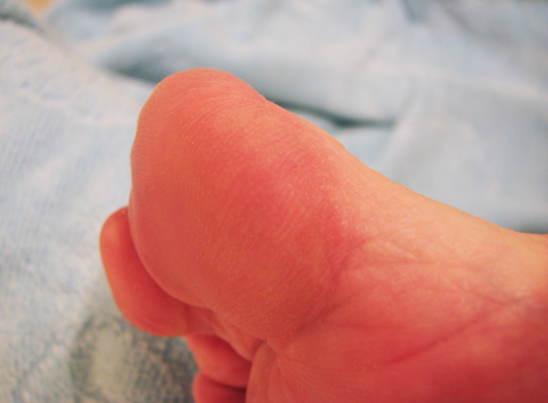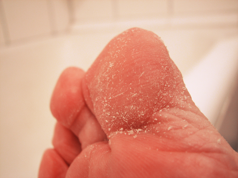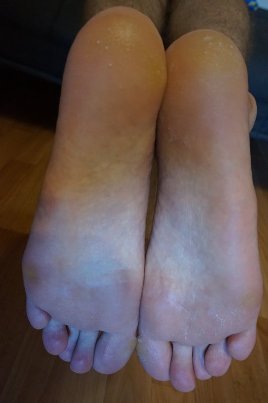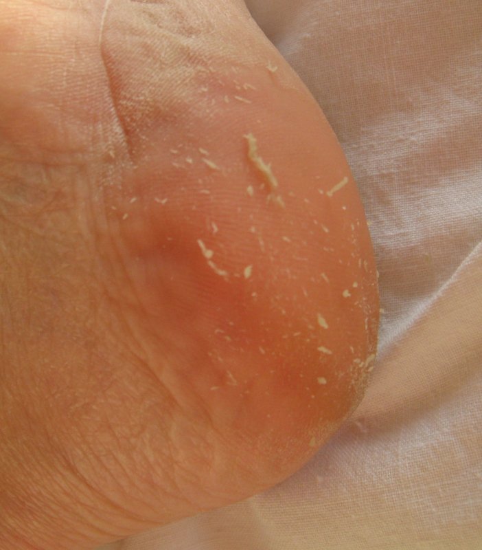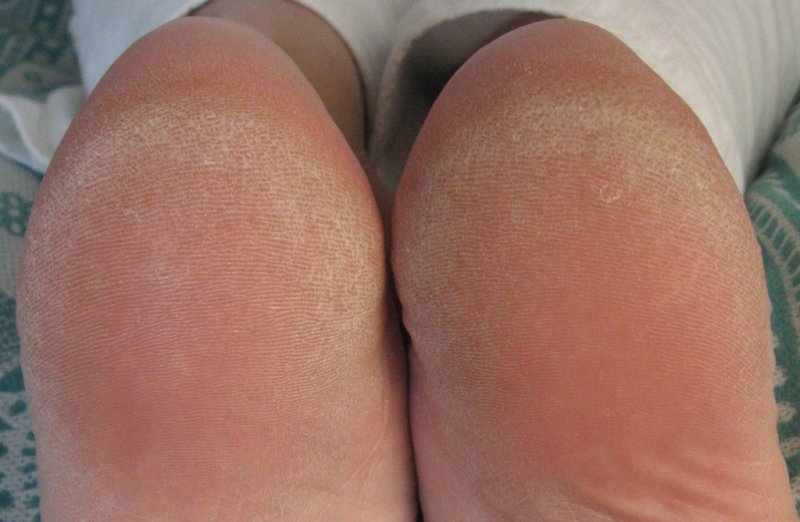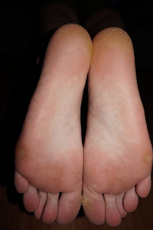 Ороговелость подушечек больших пальцев и огрубевшие пятки.