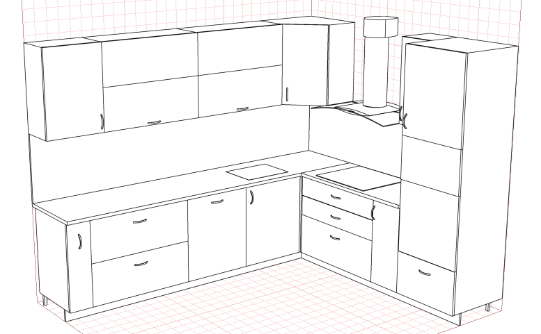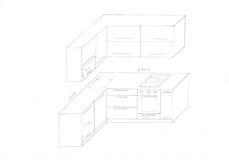 Добрый день. Подскажите сколько будет стоить изготовление кухни. Эскиз примерный я сама накалякала, цветовая гамма и фасады как на рисунке. Хочу знать ценник с обычной и акриловой столешницей.