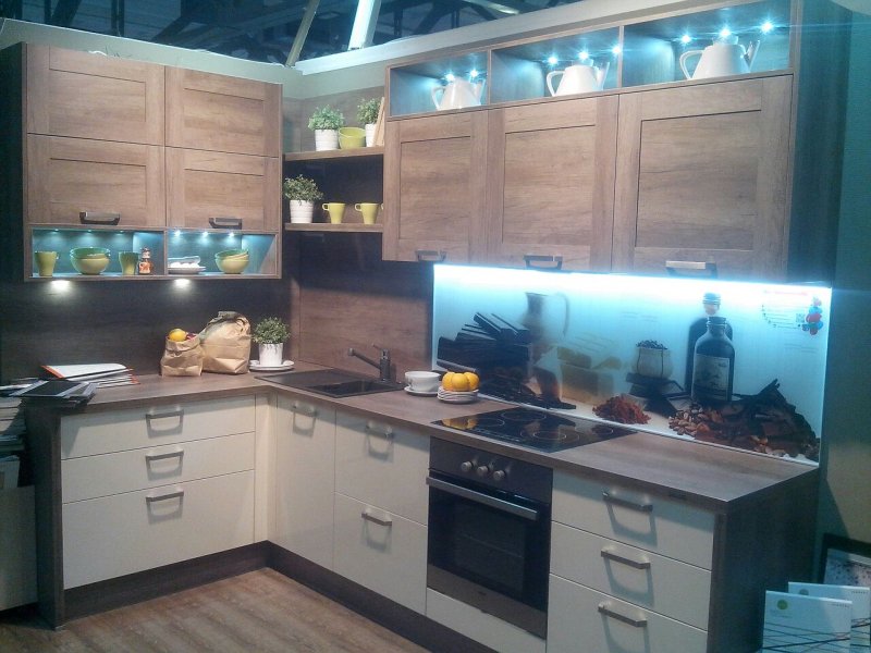 фасады белый глянец, корпус под дерево, фурнитура хорошая, но по доступной цене.
