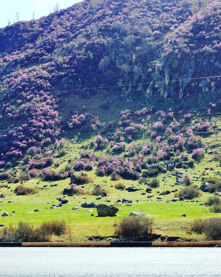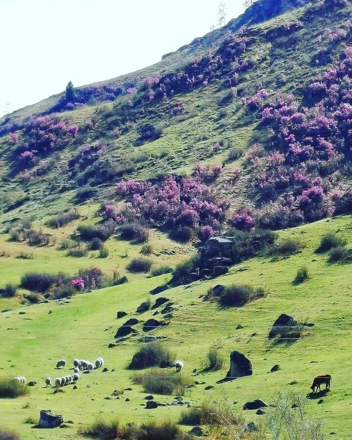 Я несколько лет хотела поехать на Алтай, чтобы посмотреть цветение рододендрона, но бывали максимум на Чемале, а там его не очень много. И светлее, чем в районе Чике-тамана. В этом году мы поехали туда специально, где-то в 5-10км за Чике-таманом начинаются горы, покрытые розовыми кустами. В горах мы были 8-10 мая, и в этом году в этих местах было самое активное время цветения. Но говорят, что в этом году цветение началось позже.