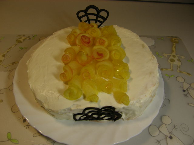 просто тортик заварной с клубникой рецепт от boney (торт просто объедение), покрыт кремом который внутри (маскапоне, сливки, сахар). Заварные коржи не ровные не смогла их хорошо выровнять, да и пока не умею . Украшен яблочками сваренными в сиропе! СПАСИБО Иринке-Сахаринке и фигурки из шоколада.