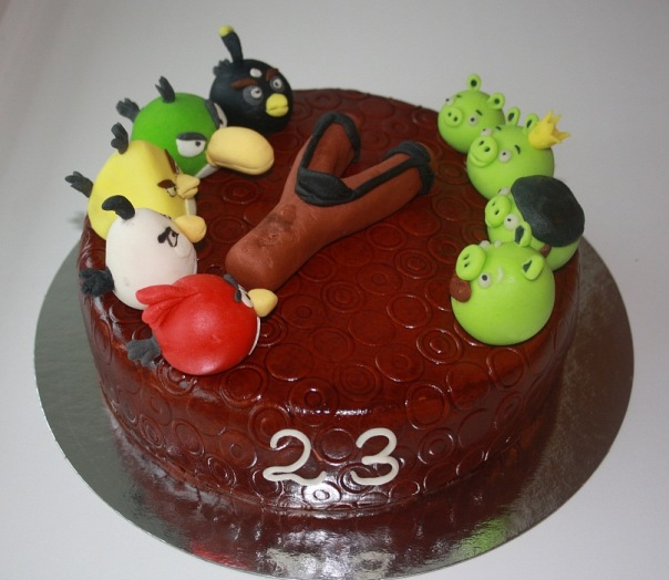 Торт по мотивам игры Angry birds. Внутри песочный с курагой и черносливом, крем творожный. Вес 2,9 кг. Покрытие - мастика. Лепка - марципан.