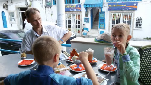 в них и заходили каждый раз. Основное меню не пробовали, только кофе-мороженое-блинчики. Пили кофе кафе в порту у Старой Медины - пыльно, колоритно, аутентично. Вобщем, все как мы любим