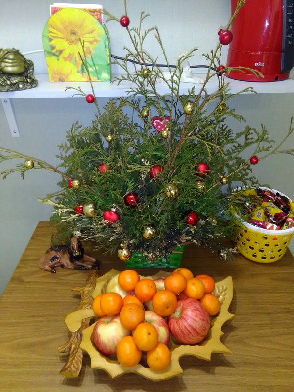 Я в прошлом году делала венок на дверь, композицию из веточек на стол и ёлочку ставила искусственную. Но коты у меня другие, старые жили. Так и то каждый день разбирали искусственную ёлку.