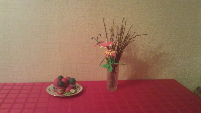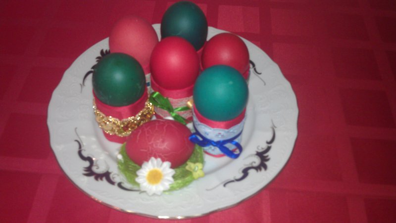 Сшила красную скатерть, сделали подставки для яиц (картон красной тканью обернула - сверху кружево и ленточка с бантиком).