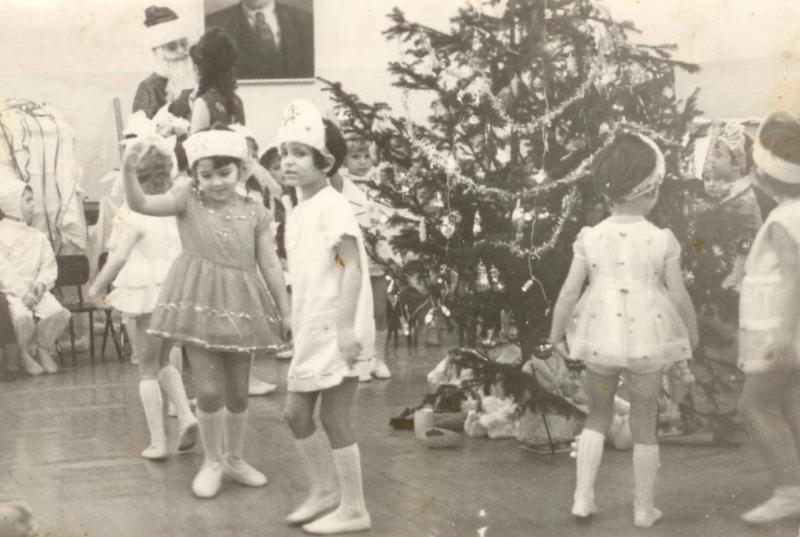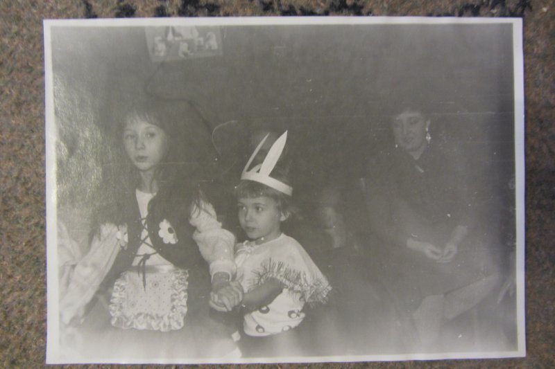 Вот ради этой темы полезла в детский фотоальбом. Когда мне было лет 6 и старше, родители каждый год придумывали костюмированную мини-постановку по мотивам сказок. Костюмы на всех членов семьи и "задник" изготавливались всей семьёй (и неважно, что цветочки и грибы на "заднике" росли боком - мой трёхлетний брат с какой стороны дотягивался, с той и рисовал, что ему поручено :) ). Сценки показывались в гостях у бабушки и дедушки (они жили рядом и мы каждый год ходили к ним праздновать НГ), там собирались родственники и друзья-соседи.