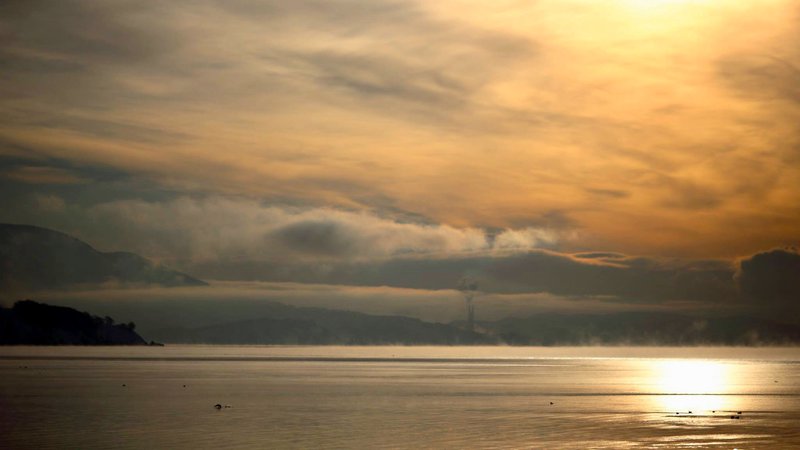 Утренний свет, пробиваясь сквозь морозную дымку, заливает Авачинскую бухту необычным цветом