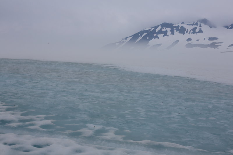 А, возвращаясь, мы увидели, что за время нашего отсутствия, снежное поле превратилось в подснежное озеро. Это одна из самых больших опасностей, подстерегающих путешественников в июле: под снежным покрывалом образуются целые озера, в которые может провалиться автомобиль. Мы, к счастью, такого не встретили, но водитель уверил нас, что вахтовки порой проваливаются по самую крышу :o
