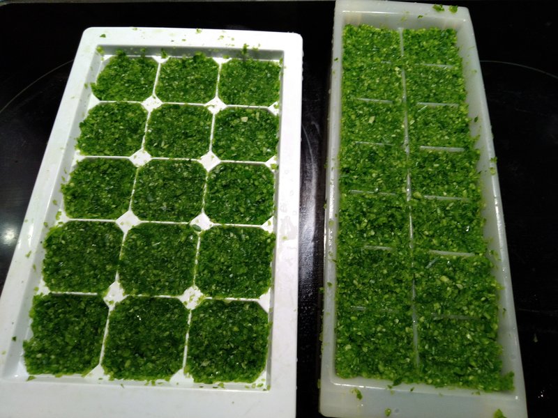 Обычно просто морожу просушенные листики - они не смерзаются и в салат или суп легко нарезаешь сколько нужно и быстренько обратно с морозилку.