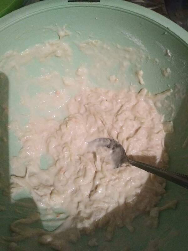 1 яйцо, 100 гр молока, 1 стакан муки, 1 ч.л разрыхлителя, соль, сахар по вкусу - замесила густоватое тесто. Добавила 1/2 головки лука (мелко нарезанного) и ~150 гр квашеной капусты, у меня с клюквой. Сначала хотела клюкву удалить, а потом подумала, а зачем? Так даже интереснее)