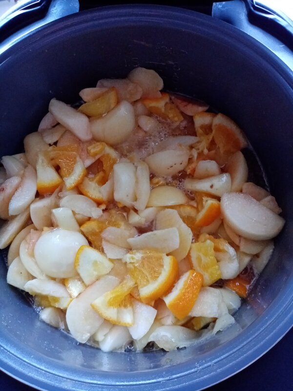 Все порезала произвольно, не крупно- добавила сахар и поставила на тушение на 1 час.