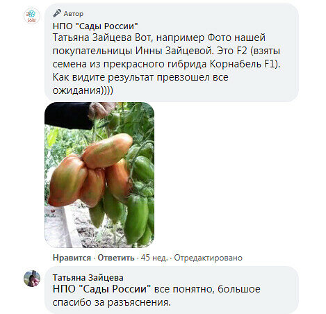 Согласна, сорт стабильный... семена тоже собрала, (буду пробовать)... но и купила. Возможно маркетинговый ход, а томат на самом деле не F - ка - сорт. СР писали о своих клиентах, которые собирают семена с Корнабеля и выращивают отличные помидоры.