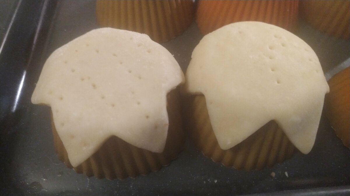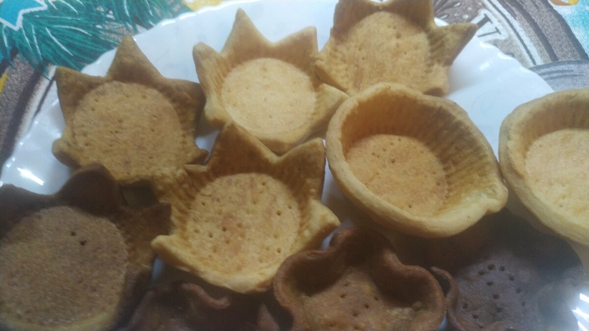 тонко раскатывали (2-3 мм), вырезали большой формочкой заготовку ( кружок и звёздочку), накалывали вилкой и надевали ее на перевернутую формочку для маффинов. Чтобы было проще - надели силиконовую формочку на круглую мельничку, на нее надевали заготовку и опускали края вниз. Махом все корзиночки так сделали, никакой возни.