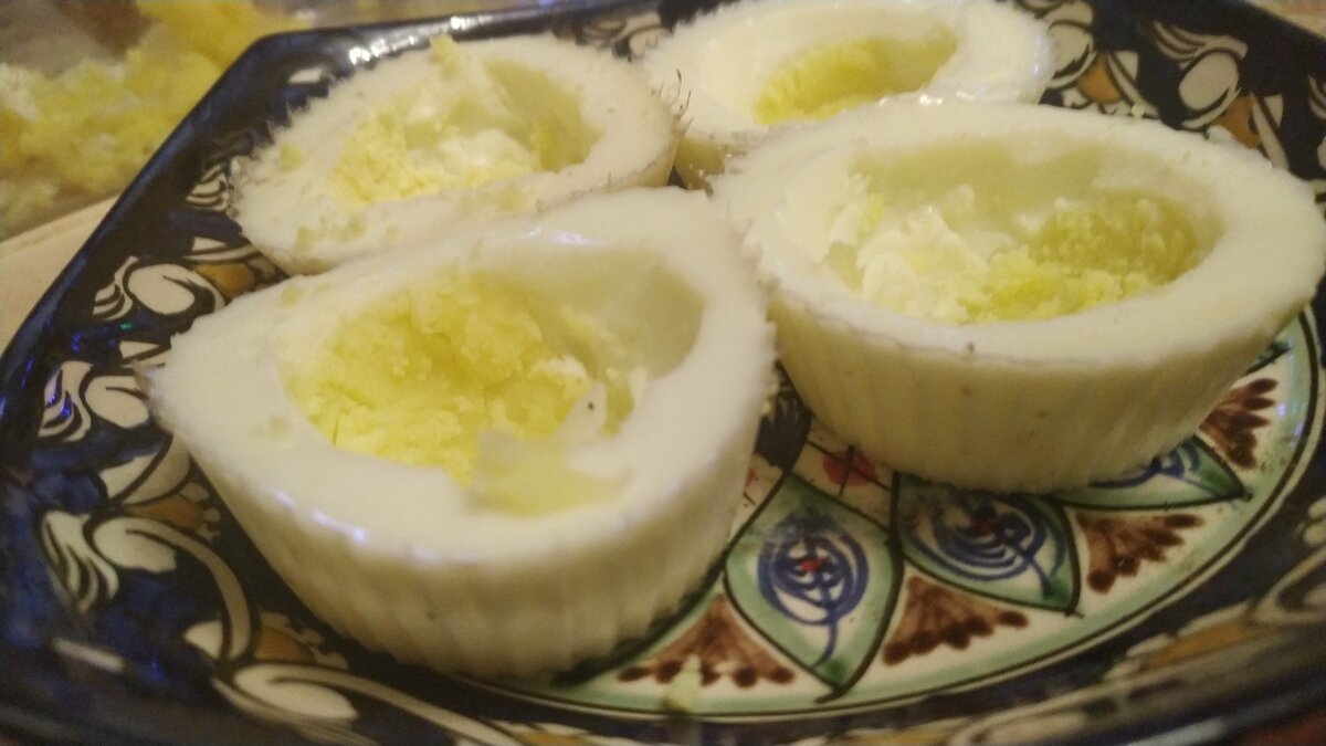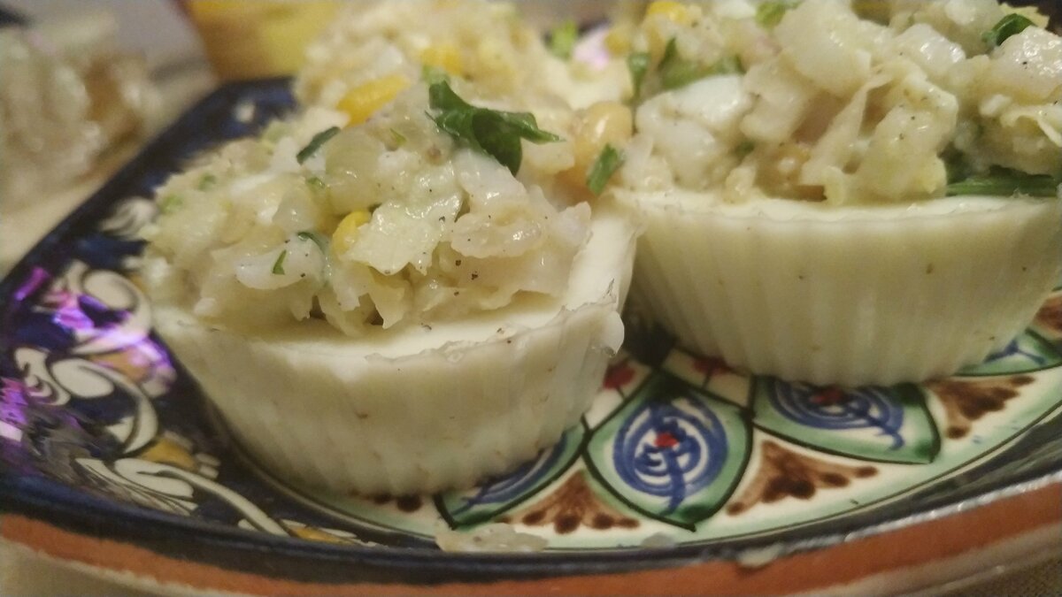 Разбиваем яйца в формочки для кексов, хорошо смазанные маслом. Варим на пару до готовности (минут 8-10 или ориентируйтесь на интенсивность работы вашей техники). Сваренные яичные корзинки остужаем, вынимаем, перевернув формочку, вырезаем серединки и добавляем их в начинку.