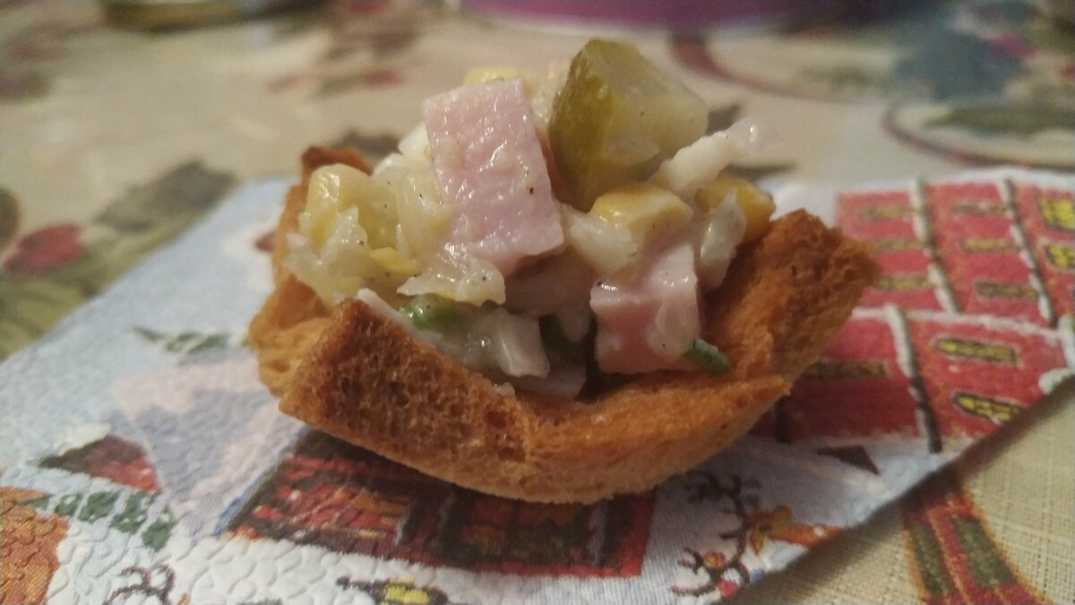 Остывают такие тарталетки быстро , сразу наполнила салатом: