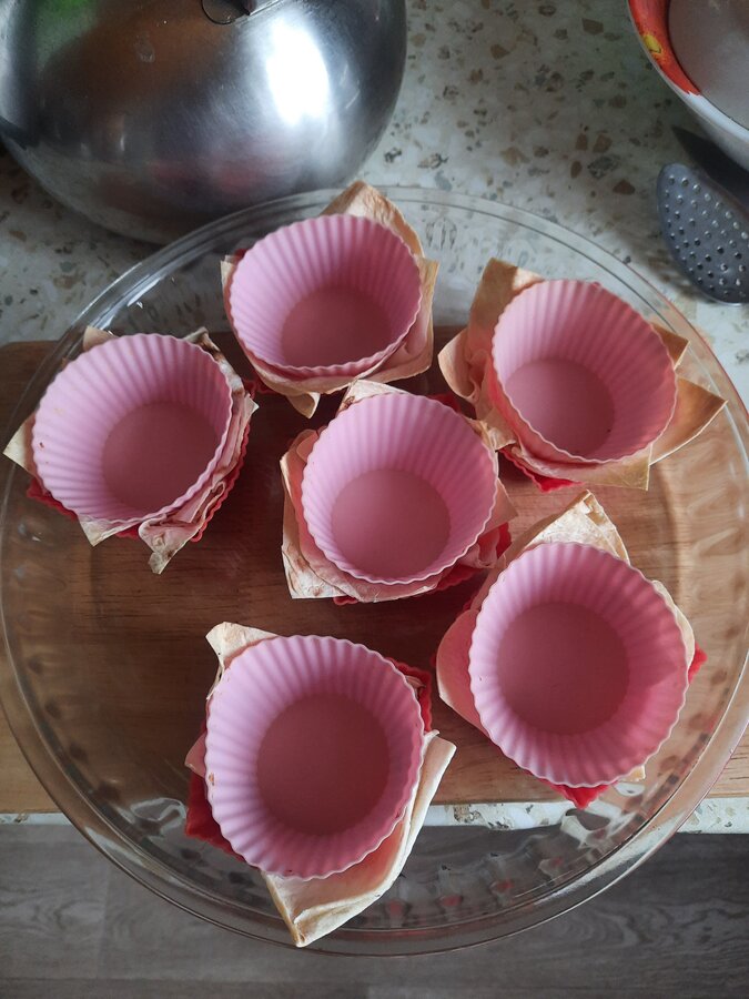 Заварное тесто с цельнозерновой мукой прекрасное в работе! Мы тонко раскатывали, вырезали банкой от горошка большие кружки, накалывали и опускали в формочки цветочком, подпихивая краешки кружка по окружности. Тесто практически само спускалось и принимало нужную форму, одно удовольстие :give_heart: . Оставалось чуть-чуть подправить донышко и все.