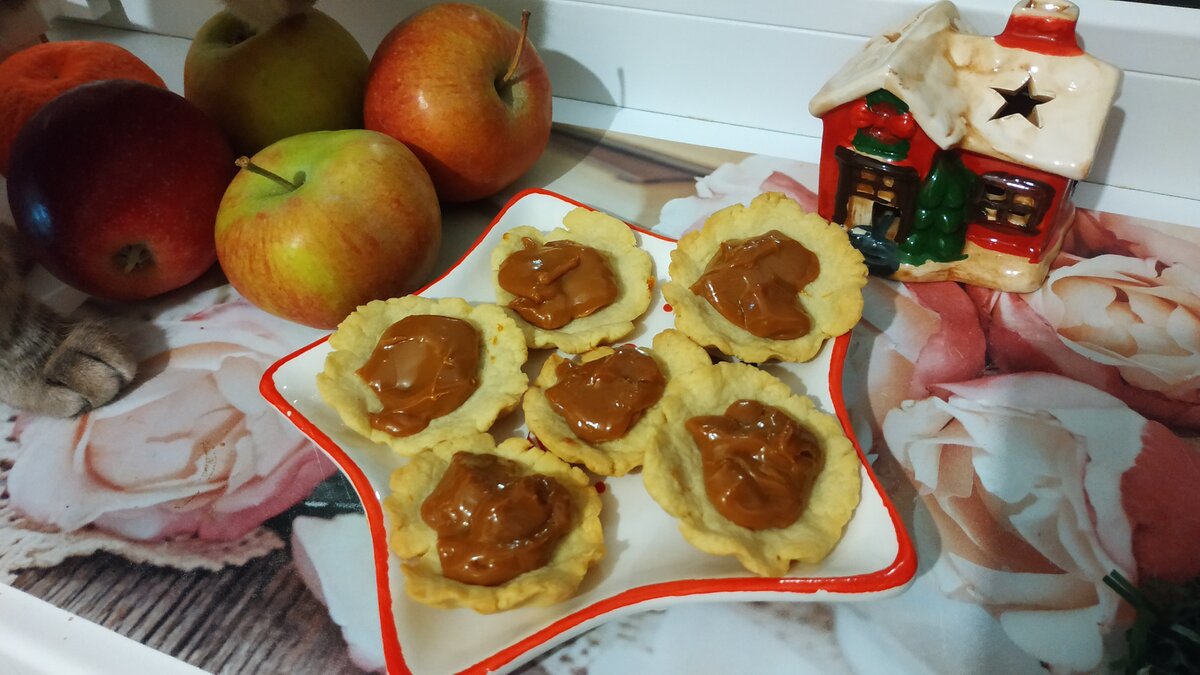 Вчера из остатков теста сделала корзиночки просто со сгущенкой. Утром очень вкусно с кофе :-)