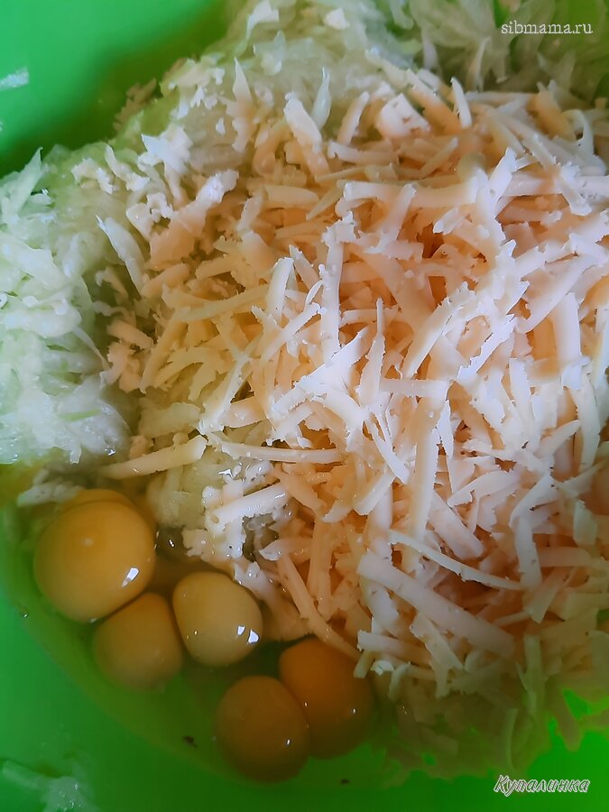Кабачок на крупной тёрке (отжимаем сок) , сыр натираем и к кабачку + яйца, немного муки и разрыхлитель. Соль и перец по вкусу. Я ещё зелени добавила. В духовку на 40мин.