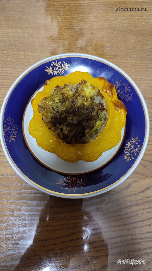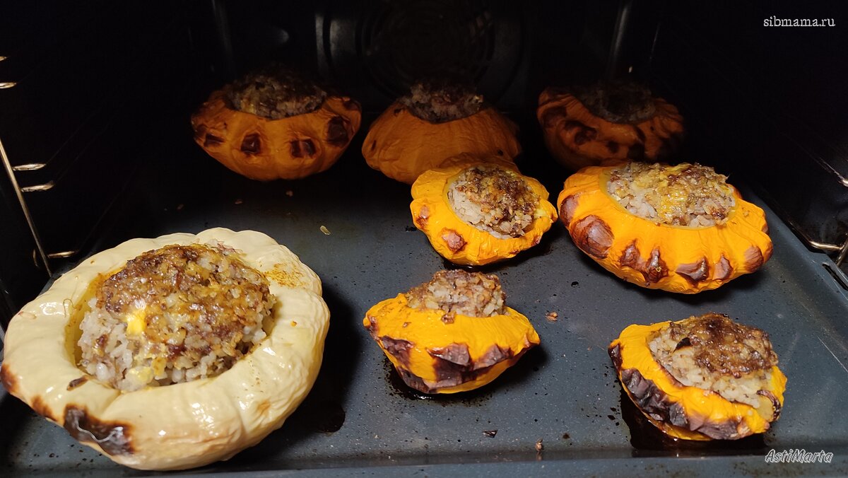 Патиссонам срезаю сверху крышечку и удаляю семена. В фарш (говядина плюс свинина) добавляю отварной рис, репчатый лук, сушёную зелень, соль, перец, специи, перемешиваю. Начинаю патиссоны. Сверху смазываю верхушку майонезом. Выпекаю в духовке.