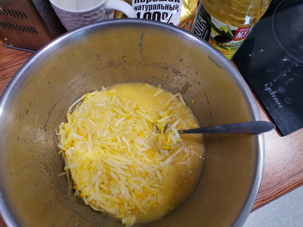 Кабачок (молодой, натертый) — 2 стак. По рецепту не надо отжимать, я беру 2 стакана уже отжатых.