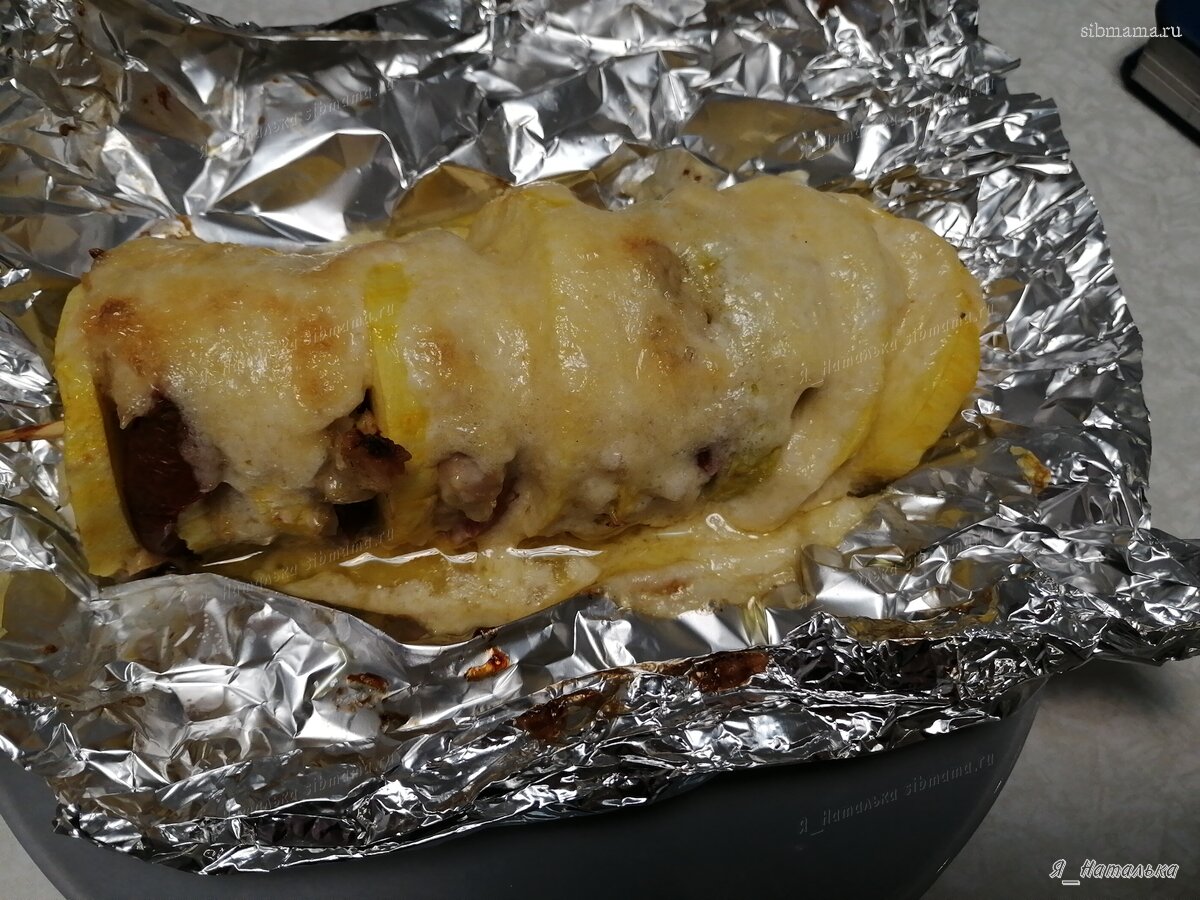 Я добавила нижним слоем фарш из индейки с луком, сверху уже кабачок с плавленным сыром, яйцами и манкой, как в рецепте. После запекания, форму держит хорошо.