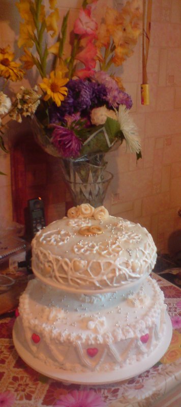 Торт с черносливным кремом, бисквит базовый, верхний ярус мастика, нижний сливки. Вообще, они должны были быть оба одинаковые... Но такого количества форсмажоров у меня еще ни на одном торте не было - от температуры сына до выключения электричества при выпекании и прорыва трубы на кухне во время затягивания... пока воду гоняла, мастика испортилась, пришлось сливки... Но получилось вполне живенько, по-моему, пожелание молодых "никаких фигурок, лебедей-голубей" оказалось как нельзя кстати)