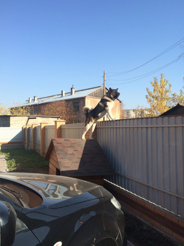 Живет наш собак в вольере. Раньше вольно гулял во дворе, но время пришло и стал убегать. Да, ворота научился открывать и бежать по собачьим девчонкам. В общем, теперь во дворе только ночью, когда ворота на проволоку закручены).
