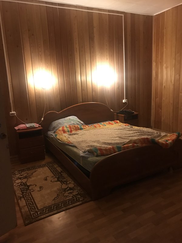 Номер оооочень большой - на входе гостиная квадратов 16 (угловой диван, кресло, большой холодильник, стол стулья, телевизор (не работает ) на полу ковер. Потом кухня малюсенькая с плитой, раковиной, всей необходимой посудой, чайником. Санузел (душевая кабина (древняя), унитаз (чистый), раковина, жидкое мыло, туалетная бумага). Спальня тоже большая с двуспальной кроватью (скрипит неимоверно просто), плательный шкаф, прикроватные тумбы, бра, обогреватель.