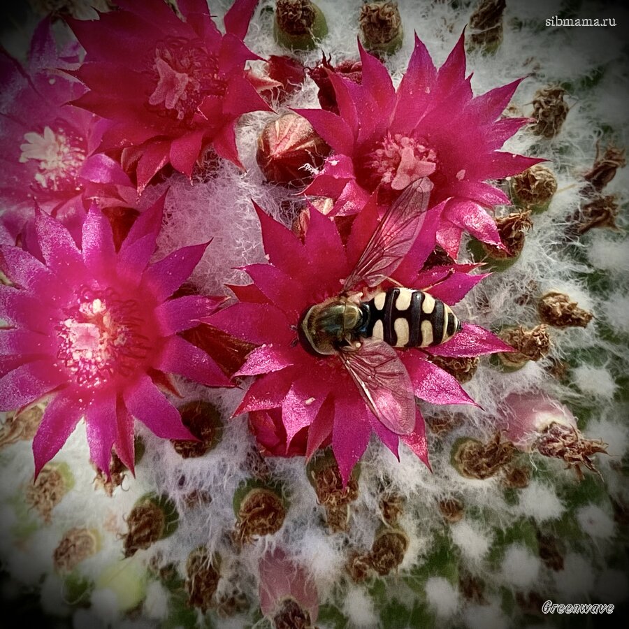 Mammillaria polythele 'Toluca' (Mammillaria polythele f. nuda) и муха-журчалка.