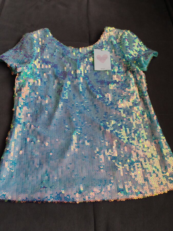 Нарядный топ, р. xs (40-42), от груди чуть расклешён -скроет несовершенство талии (если нужно). Приятный ментоловый оттенок подклада, сверху сетка с пайетками, не просвечивает. Купила на Авито, но мне великоват.