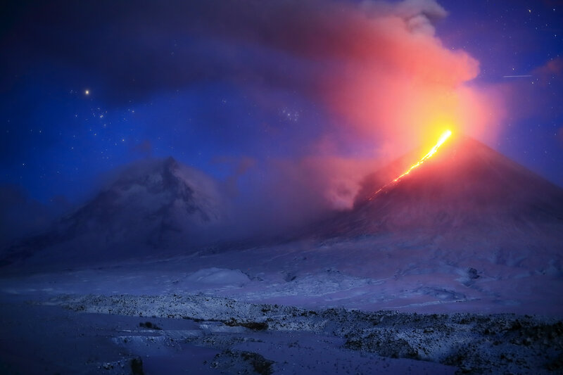 20.11.20. Извержение вулкана Ключевская сопка. А слева виднеется вулкан Камень.