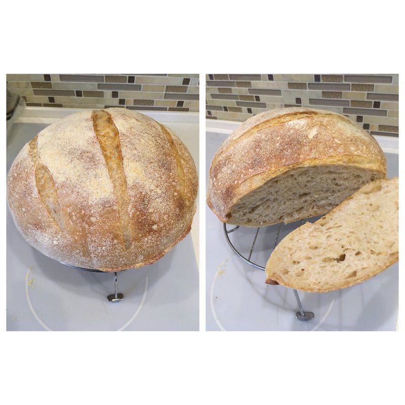 Кое-как удалось его на расстойку уложить. В холодильнике ночью не поднялся совсем. Видимо, у меня там слишком холодно (5 градусов). Утром достала и еще часа три стоял при комнатной температуре. И даже тогда не сильно "подрос". Но зато в духовке чуть крышку от кастрюли не поднял :haha: