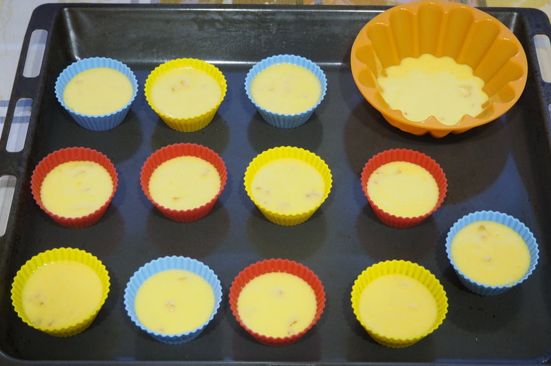 Формочек силиконовых у меня 12 штук, а оставшееся тесто сливаю в большую формочку.