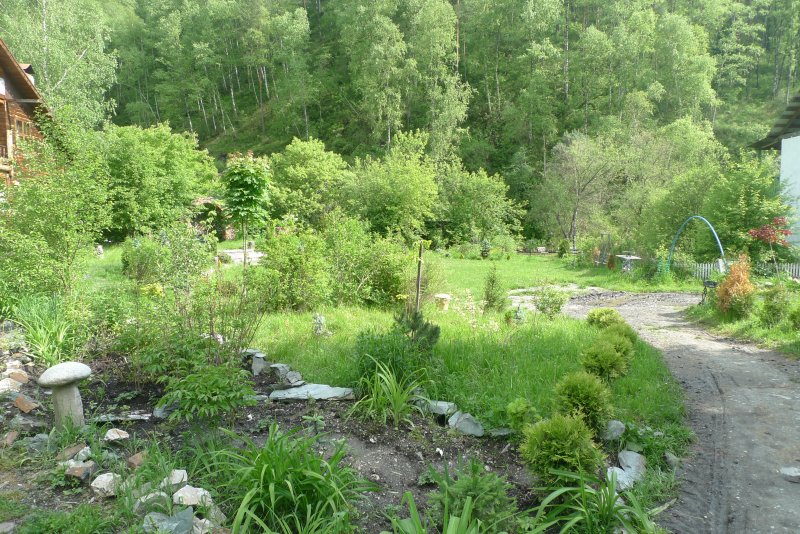 Но..как-то все-таки простовато.Сэкономили,видимо на ландшафтном дизайнере.Цветы растут просто вдоль дорожек.Альпийских горок вообще нет-и это на Алтае,где куча красивейших камней...честно говоря не пойму,когда отцветают пионы и розы -что там смотреть.