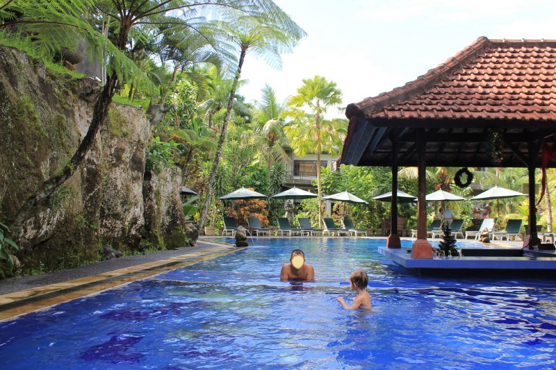 Самый дешевый номер был просторным, чистым, с кроватью, тахтой, гардеробом и балконом. Ресторан не плохой. Вид на ущелье - фантастический. Бассейн с соленой водой (явно требует ремонта), и пресной. Общая атмосфера неповторимого Убуда. Но людям не готовым несколько раз в день покорять по 100 ступенек въезжать не стоит. Посещения стоит ресторан Грязная утка и естественно заказать утку.
