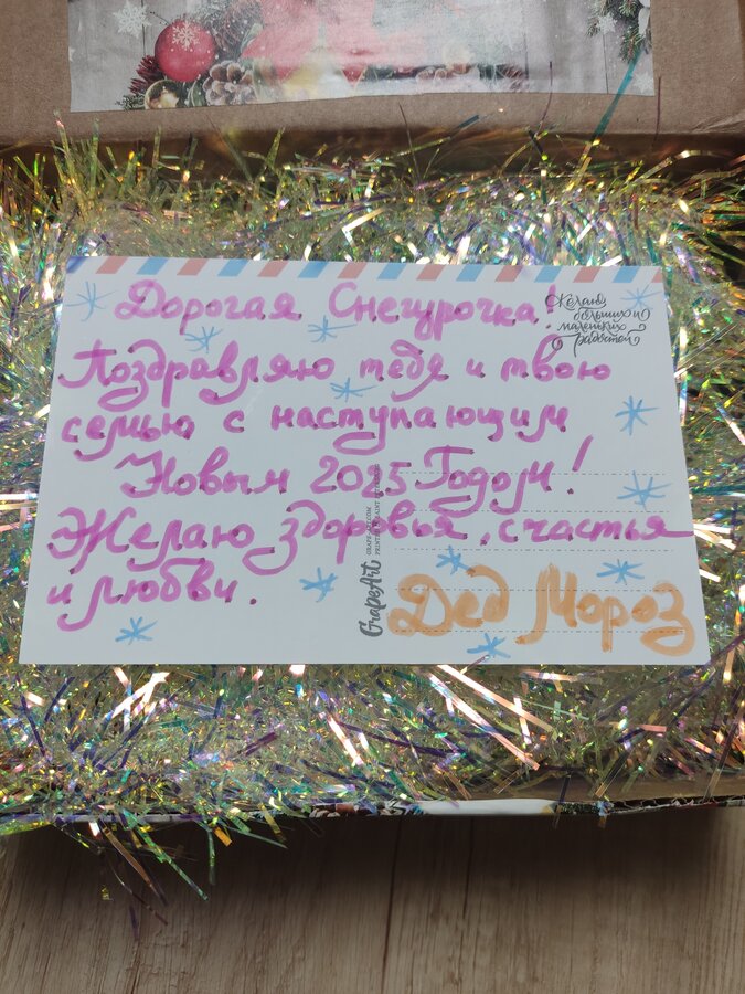 Открыла, а там все в мишуре, и в специальном карманчике открытка, письмо-поздравление от Дедушки Мороза