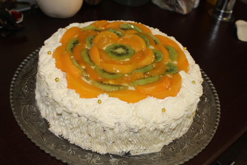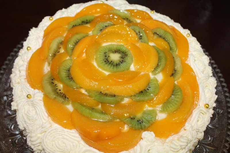 украшала персиками, абрикосами,киви и желе прозрачным.