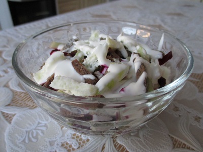 говядина отварная, огурец свежий, свекла отварная, картофель отварной, белок яйца (приготовлен в мультиварке, так он получается воздушно-лохматый), сметана, соль - соотношение произвольное.
