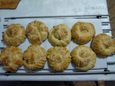 6. Каждый колобок раскатала в прямоугольник, сделала надрезы, выложила начинку и сформировала булочки.