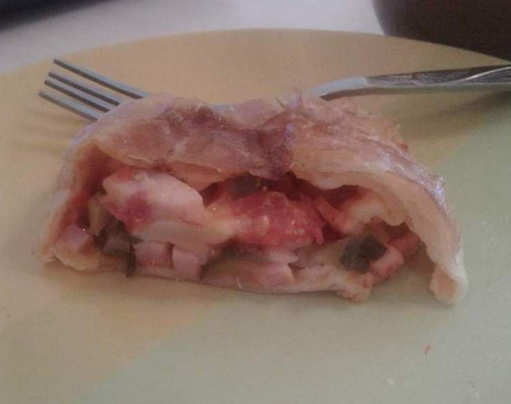 Тесто-слоеное! Сверху взбитым яичком надо помазать обязательно. Выпекать примерно 15-20 минут. У нас съедаются махом! И ребенок в школу для перекуса берет.