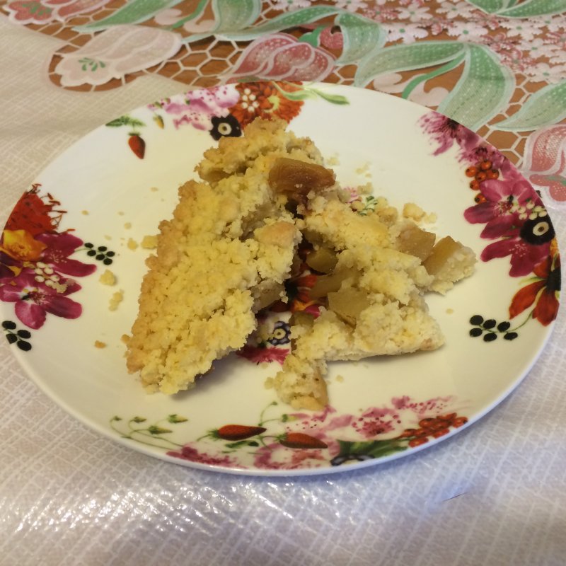 У меня было два старых яблока. Я их почистила, порезала, посыпала сахаром и корицей (совсем немного того и другого). Сверху крошкой из 100 гр сливочного масла, 1 стакана муки и 3 ложек сахара. Запекала 35 минут при 180 градусов. Получилось вкусно, только сладковато.