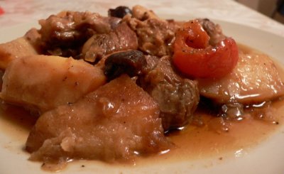 Подготовленные продукты укладывать в один большой горшок для запекания или кастрюлю для запекания, в таком порядке: мясо, картофель, чернослив, лук, томатный соус, помидоры, порезанные крупно. По вкусу добавляется соль, перец. Все заливается 1,5 стаканами бульона или воды и ставится в духовку на 180 градусов 1 час.