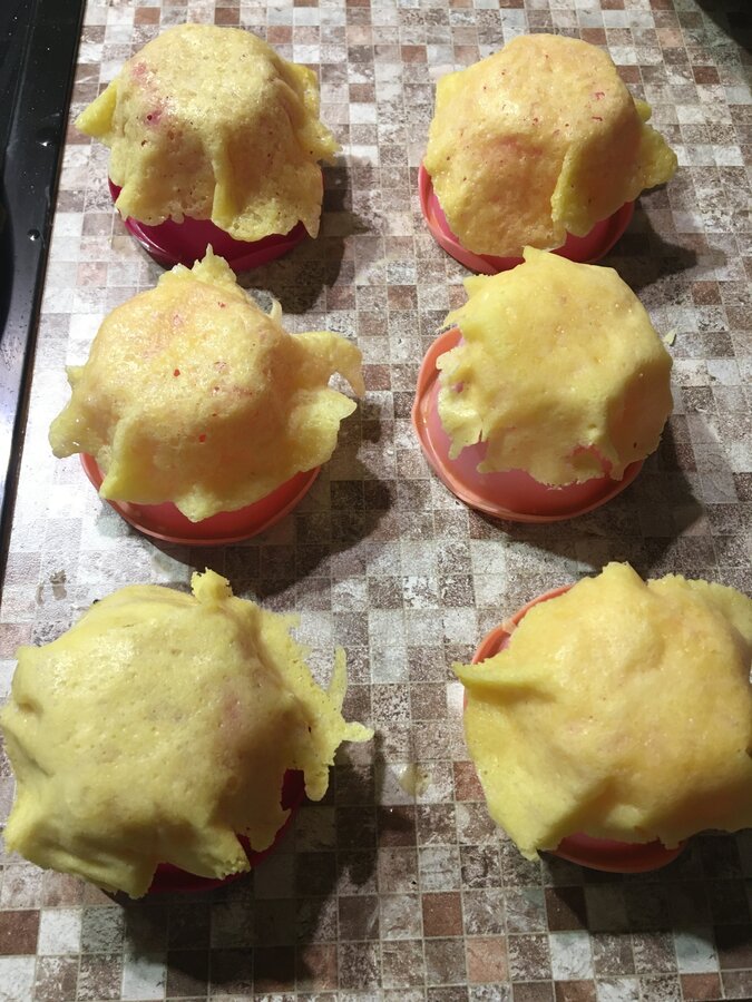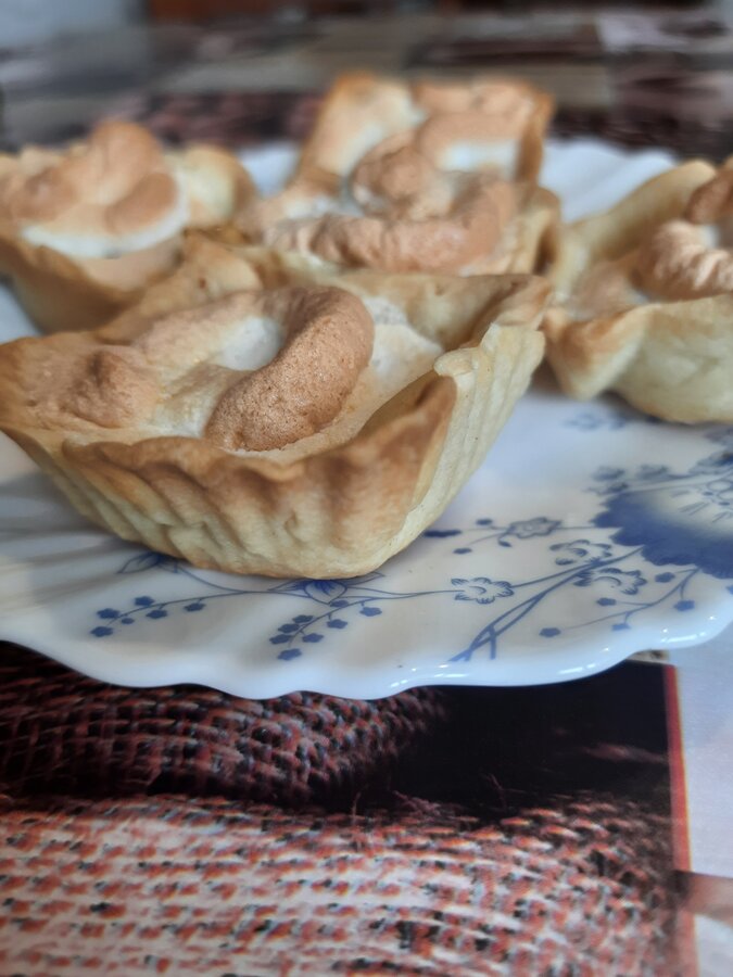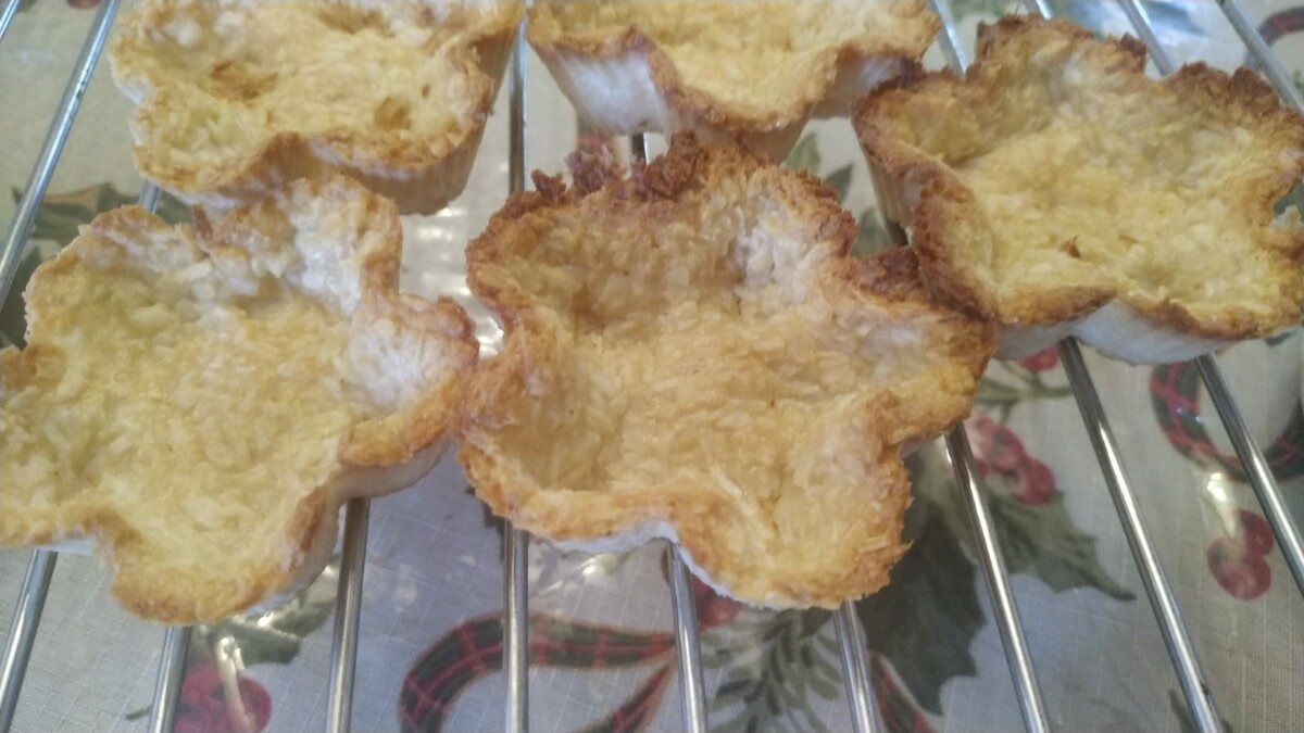делала половину порции, и все равно немного стружки не хватало. Добавила сухого кокосового молока. Сахара меньше, мы не любители. У меня получилось 5 небольших корзиночек. Ещё сидят в духовке
