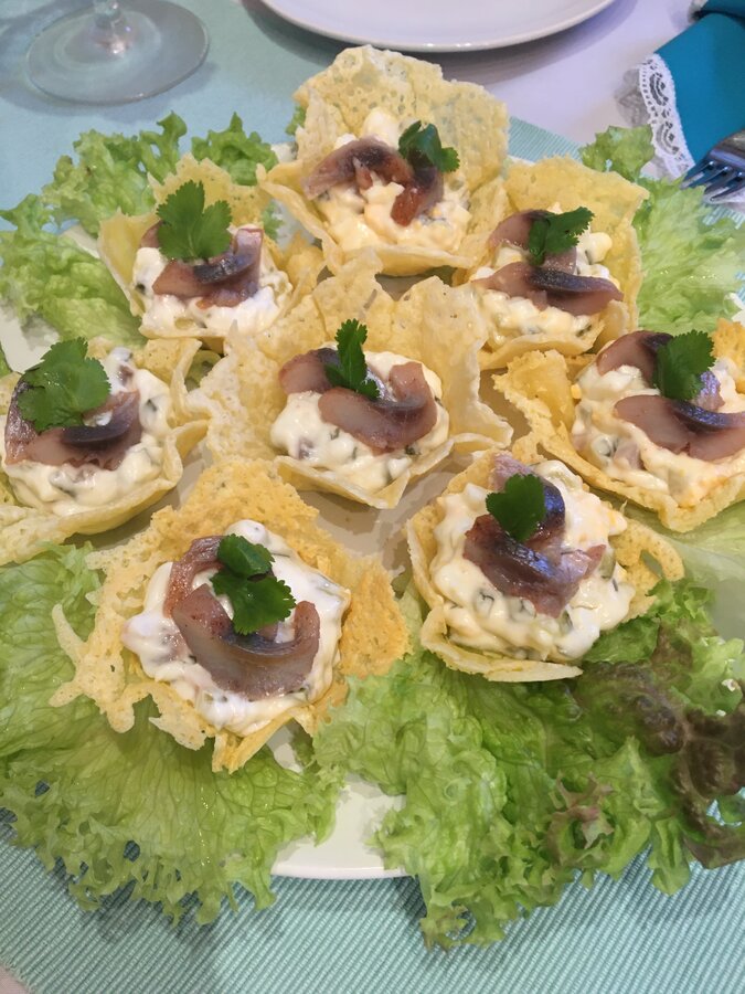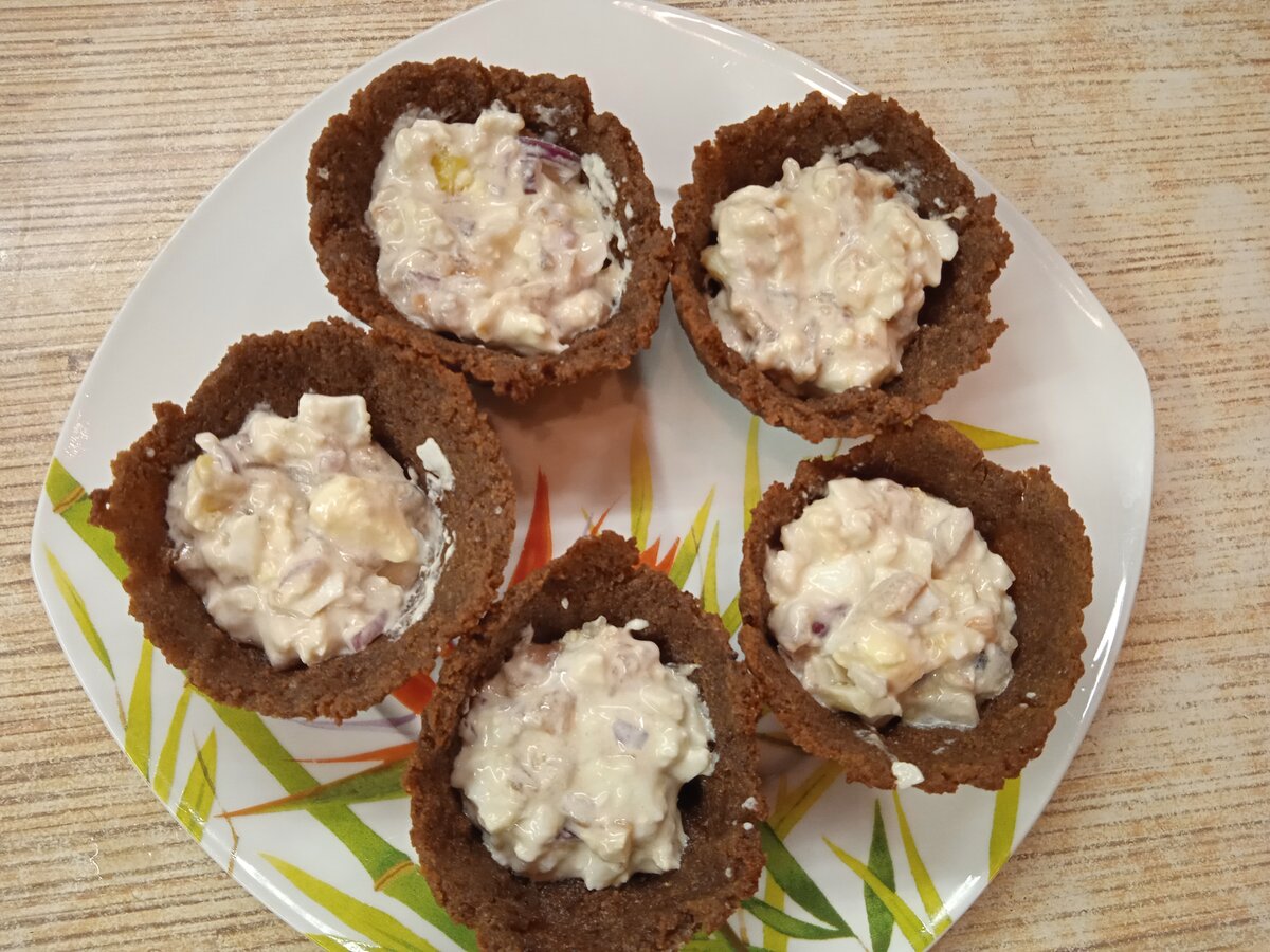 Ещё мы любим слегка смазанные растительным маслом тарталетки из порезанного черного хлеба, свёрнутые "кулечком".