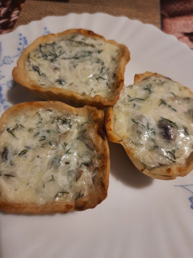 Я же сделала куриные тарталетки с грибами, из фарша. С заливкой, немного картошки в начинку. Ооочень понравились горячими, сразу съели. Спасибо большое за рецепт!